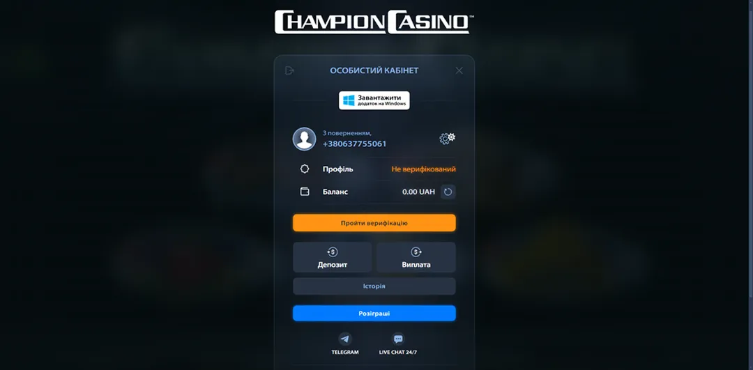 Чемпіон казино відкриває доступ до широкого функціоналу особистого кабінету. Керуйте акаунтом, контролюйте депозити та історію ігор, а також налаштовуйте бонуси та персональні параметри.