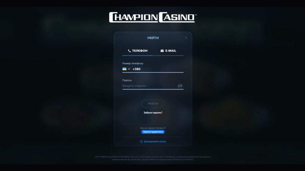 Процес реєстрації у Чемпіон казино максимально простий та швидкий. Оберіть один із двох способів: за номером телефону або через електронну пошту. Для реєстрації необхідно ввести основні дані, підтвердити контакт за допомогою SMS або e-mail, після чого акаунт стає активним і відкриває доступ до ігор, бонусів та всіх функцій платформи.