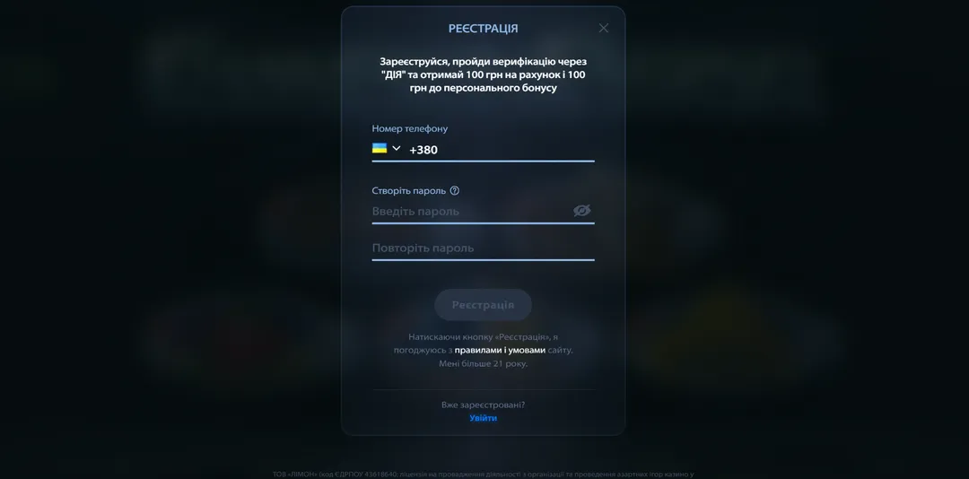 Щоб створити акаунт через телефон, користувач вводить номер, отримує SMS з кодом підтвердження, вводить його у форму та завершює процес. Після цього акаунт активується, і можна одразу грати, отримувати бонуси та користуватися особистим кабінетом.